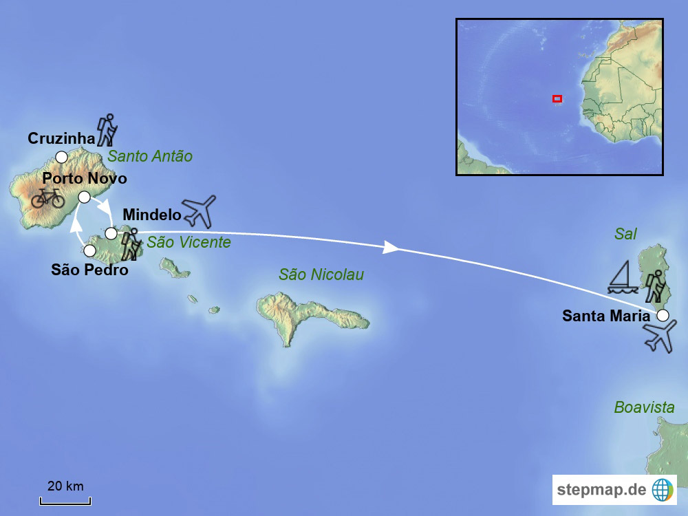 Jede der drei Inseln hat einen besonderen Schwerpunkt: São Vicente ist das kulturelle Zentrum der Kapverden, Santo Antão die wohl schönste und vielseitigste Insel des Archipels und Urlaub auf Sal bedeutet Entspannung pur an schneeweißen Stränden. Insgesamt ist die Reise eine schöne Mischung aus Exotik, sportlichen Aktivitäten, spannenden Begegnungen und entspannten Tagen am Meer.
