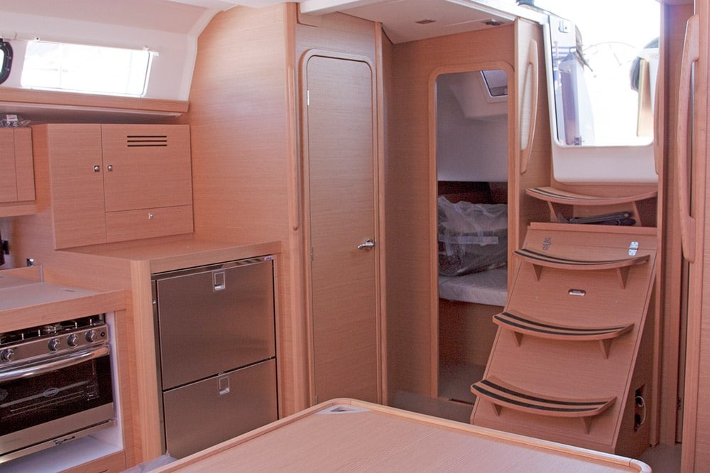 Stellt euch bitte darauf ein, dass es auf einer sportlichen Fahrtenyacht unter Deck recht eng ist. Besonders die Kabinen bieten außer den Kojen nicht viel Platz. Sie werden auf einem Törn auch nur zum Schlafen genutzt.