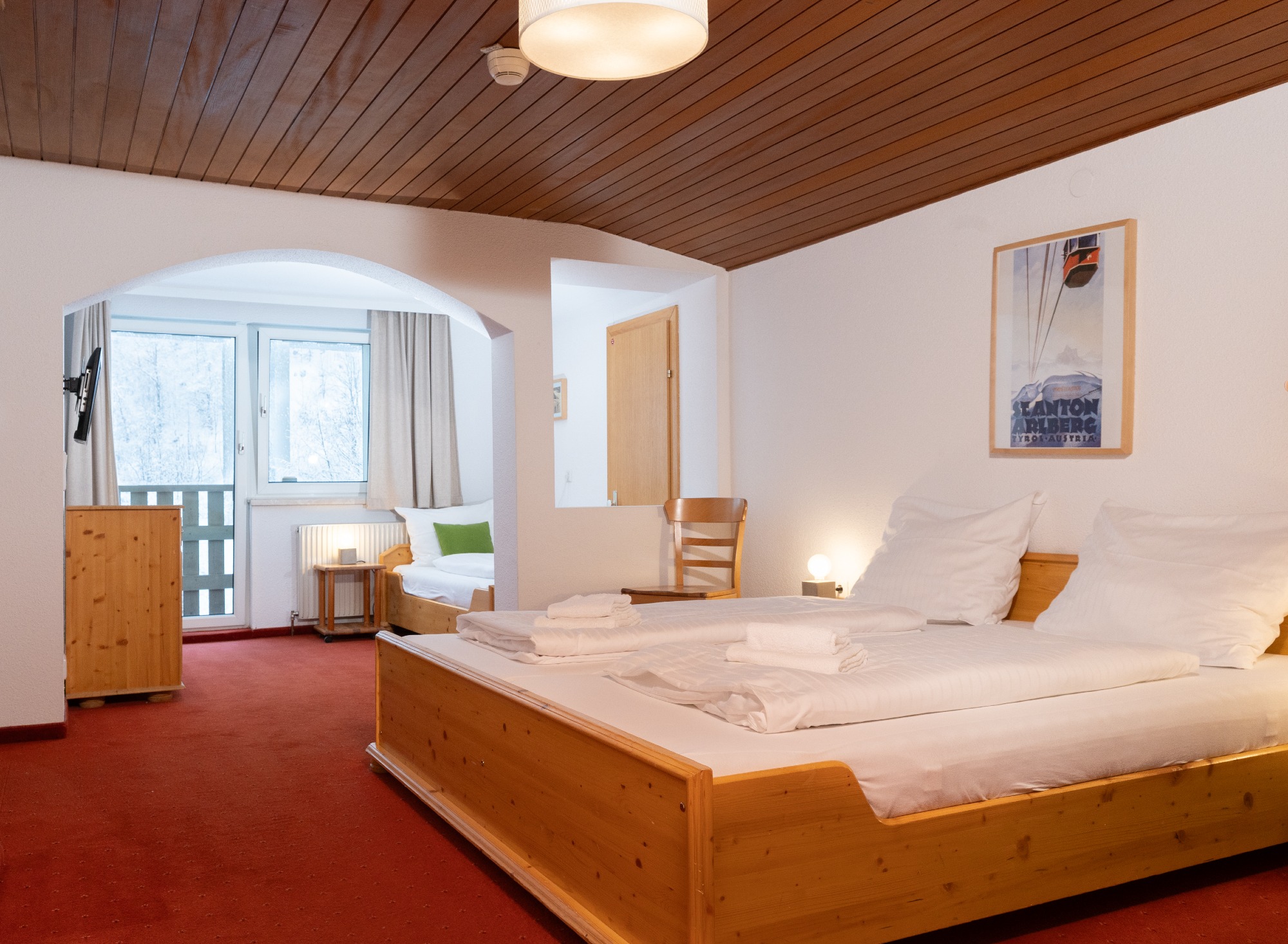Sportclub Arlberger Hof. Der Arlberger Hof mit insgesamt 28 Gästezimmern bietet alles, um sich rundum wohlzufühlen. Der rustikale Speise-/Aufenthaltsraum mit Bar sorgt für eine lockere, gemütliche Atmosphäre. In der Almrauschbar, dem hauseigenen Partykeller, können wir beliebig feiern, ohne zu stören. Die großzügige Sauna kann kostenlos genutzt werden. Die Zimmer sind freundlich und zweckmäßig eingerichtet, teilweise mit kleinem Balkon. Einige wenige Zimmer mit Etagendusche und separatem WC.