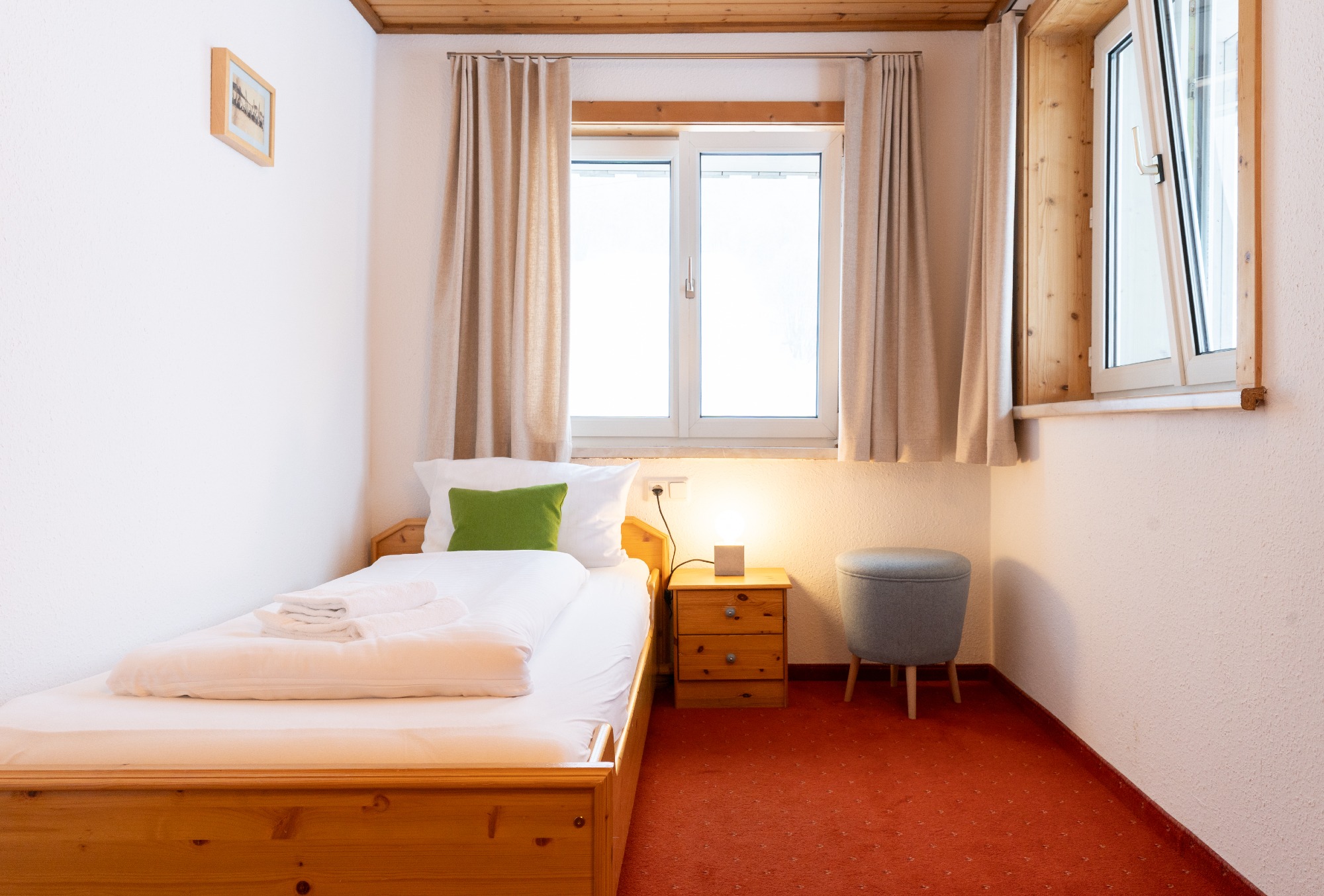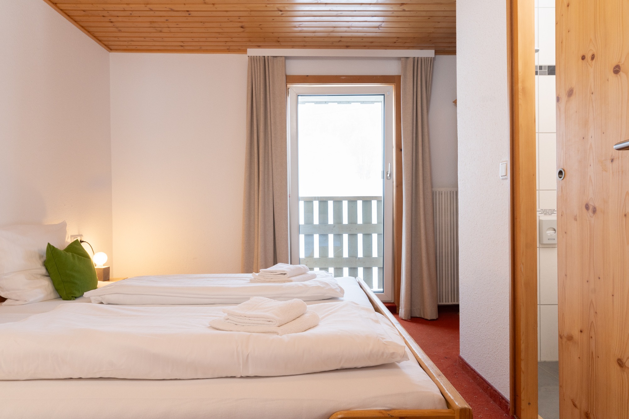 Bettwäsche und Handtücher sind in den Zimmern vorhanden. Saunahandtücher und Bademäntel könnt ihr gegen eine Reinigungsgebühr (2,– bzw. 6,–) bei uns ausleihen.