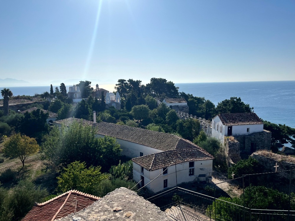 Agios Andreas. Unser Urlaubsort ist ein kleines Fischerdorf, etwa 40 Kilometer vom Flughafen Kalamata entfernt. Hauptanziehungspunkt ist sicherlich der lange, Kies-/Sandstrand, der sich am Dorf und darüber hinaus entlangzieht. Und sonst? Eine Uferpromenade, ein gemütlicher kleiner Hafen, eine byzantinische Kirche, einige Tavernen, Minimärkte, Ferienhäuser, kleine Hotels – das ist schon alles. Tatsächlich gibt es hier noch Fischer, die früh am Morgen ihre Netze einholen und am Abend die Tavernen bevölkern. Der mehrmals täglich verkehrende öffentliche Bus verbindet Agios Andreas mit Kalamata und dem bezaubernden Koróni.