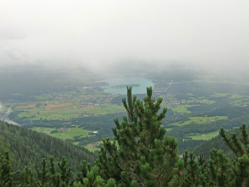 Nach einem ausgiebigen Frühstück konnte es nun endlich losgehen. Trotz Regen begannen wir den Aufstieg Richtung Kranjska Gora. Über Forstwege ging es erst durch Wälder. Gleich zu Anfang wies ein Schild darauf hin, dass wir uns in einem Bärengebiet befanden. Leider zeigte sich Meister Petz die ganze Woche nicht. Es sollte sich herausstellen, dass der erste Tag das Prädikat „sportliche Wanderung“ verdient hatte. Mit ±1500hm/1600hm war es die anstrengendste Etappe der Tour. Das schlechte Wetter entmutigte uns allerdings nicht und wir überquerten am Jepzasattel auf ca. 1434m Höhe die Grenze nach Slowenien. Weiter bergauf, ging es in die Karawanken. Die Aussicht vom Schwarzkogel präsentierte sich heute leider verhalten. Trotz der Höhe von 1842m konnten wir die Aussicht nicht genießen. Nach einer kurzen Rast begannen wir den Abstieg nach Kranjska-Gora zu unserem ersten Hotel in Slowenien. Durch den Besuch von Putin, tags zuvor, waren die Zimmer im Hotel teilweise blockiert und unsere Gruppe verteilte sich auf weitere Schlafmöglichkeiten. Dank der guten Organisation und Improvisation vor Ort, konnten wir Abendessen und Frühstück gemeinsam genießen.