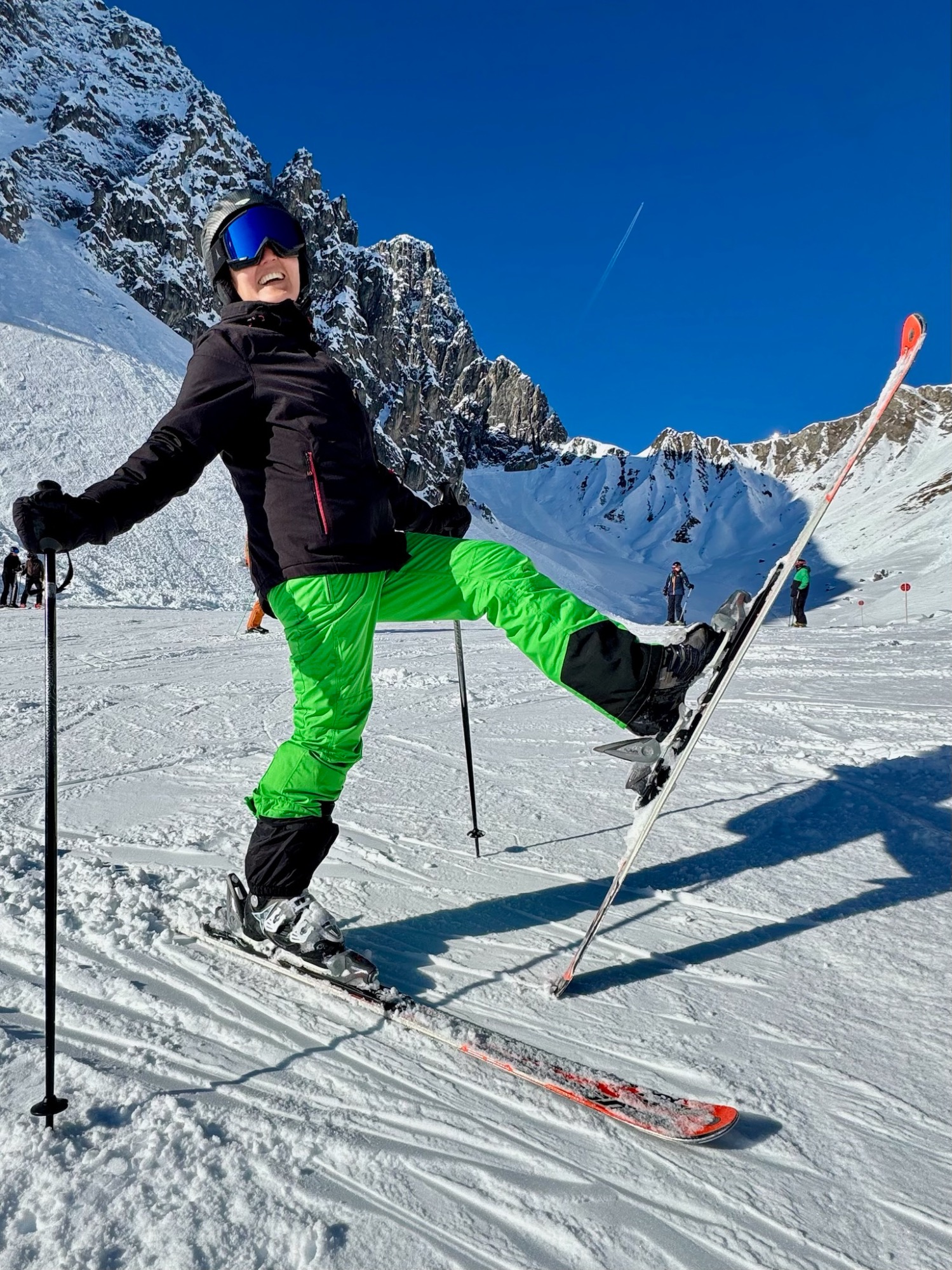 Und genau das hat Dana bereits am nächsten Morgen bewiesen: Sie fuhr mit dem Auto eine halbe Stunde nach Lech um einem Gast den vergessenen Skipass zu bringen. Die beiden Gruppen – Panorama und Speedys – überbrückten die Wartezeit mit Aufwärmübungen. Ein extra von Frosch gecharterter Bus hatte uns zuvor direkt zu der Gondel gebracht, die ins Gebiet Warth und Schröcken führt – ein nicht so überlaufener Teil des Skigebiets mit schönen Abfahrten bei strahlendem Sonnenschein und besten Schneebedingungen. Der erste Tag war ein Traum.