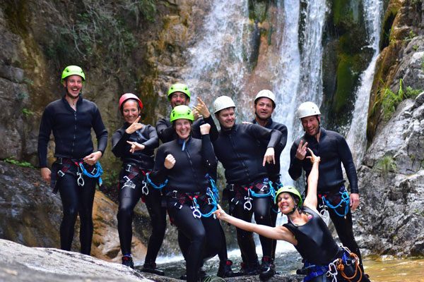 Den Rest bekommt Ihr von uns: Neoprenanzüge, Socken, Schuhe (jawoll, Ihr braucht kein festes Schuhwerk, wenn Ihr am Auto aus euren Flipflops schlüpft, steigt Ihr direkt in die Canyoning-Schuhe ein, mit denen wir auch den Bergpfad hochlaufen und am Ende wieder bei den Autos und Euren trockenen Sachen landen), Helm, Gurt, Einweisung, eine kleine Schokolade zwischendurch, Sicherheit, viele coole Erinnerungsfotos und jede Menge Adrenalin und Spaß.