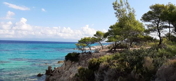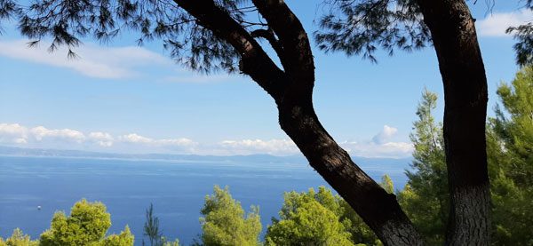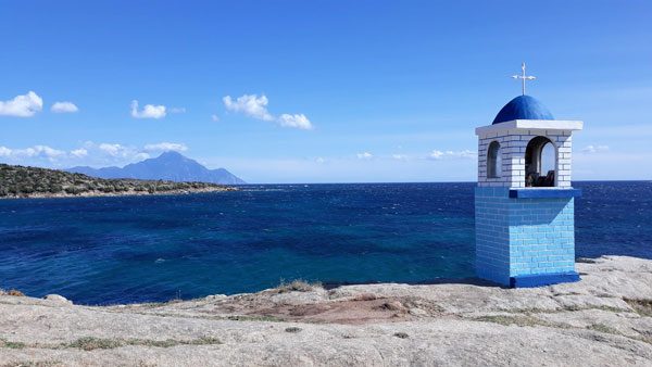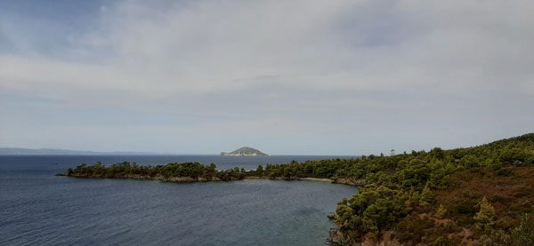 Das absolute Highlight für uns war die „Coast to Coast“-Tour. Mit dem Bus und den Bikes auf dem Anhänger geht es früh am Morgen zur anderen Seite der Sithonia-Halbinsel. Mit dem Bike dann 35 km zurück nach Sarti. Teilweise mit längeren Anstiegen über Schotterpisten. Die Ausblicke sind jedoch einfach nur traumhaft. Ziemlich zu Anfang geht es vorbei an der Schildkröteninsel, die Insel liegt wie eine schlafende Schildkröte im Meer. Eingekehrt sind wir in einem landestypischen Restaurant direkt am Meer mit kleiner Bucht und der Möglichkeit eine Runde zu schwimmen.
