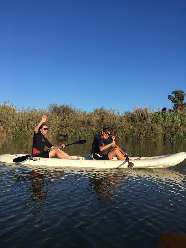 Wir paddelten durch wilde Ufervegetation und fühlten uns ein bisschen wie im Urwald, auch wenn wir statt Krokodilen – glücklicherweise – nur verschiedene Vogelarten beobachten konnten. Wunderschön. Nach rund einer Stunde machten wir Halt. Und da stand einer der „Wasserguides“, der uns Sekt, Orangensaft und Kuchen servierte.