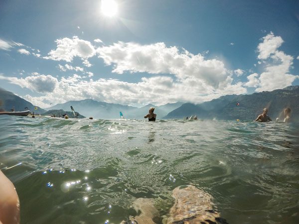 Wir radeln mitten auf die Liegewiese am See und es geht ein tiefer Seufzer durch die Gruppe. Erleichtert klatschen alle miteinander ab, danach springe ich sofort mit einigen Teilnehmern ins kühle Nass. Wir sitzen dann noch einige Zeit gemütlich zusammen, trinken etwas und brechen dann zu unserer Unterkunft in Verceia auf.