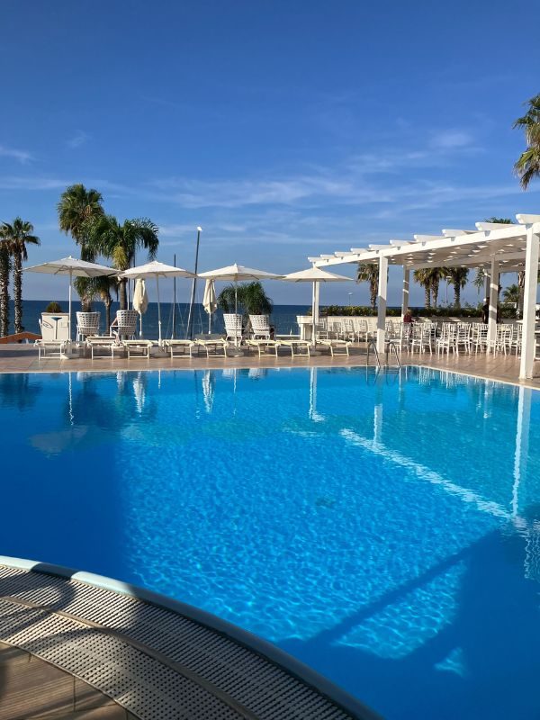 Die Lage ist absolut top, und Pool, Terrasse und Speiseräume sind in elegantem Weiß gehalten. Unser Zimmer war etwas einfacher, aber sehr zweckmäßig, vor allem das Bad.