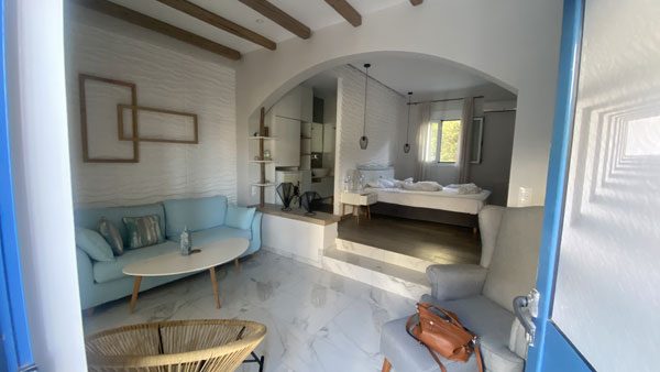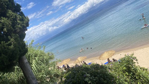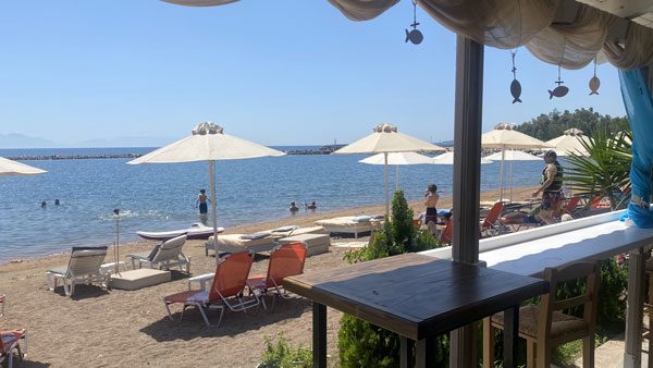 Der Club Aggelos ist ein kleiner Club direkt am Meer, also man fällt wirklich aus dem Zimmer ins Meer, kein Witz. Er wird in langer Familientradition nun von der Tochter des ehemaligen Inhabers Eirini und ihrem netten Team, geleitet. Vor Ort wurden wir von Birgit (Wanderguide), Thomas (Bikeguide) und den beiden Teamern für die Kids, Anouk und Anna, willkommen geheißen. Es gab kühle Getränke und Obst. Die Zimmerschlüssel wurden verteilt und dann gings erstmal ans Auspacken bzw. Strand inspizieren.