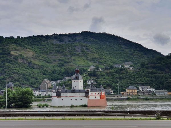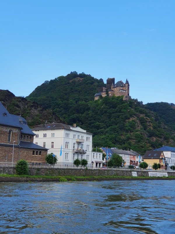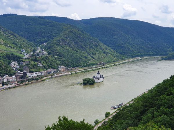 Die erste Etappe führte mit teils etwas steileren Anstiegen hinauf zur Schönburg, von wo aus man eine tolle Aussicht über den Rhein hatte. Dort war Zeit für eine kurze Verschnaufpause und eine kleine Stärkung bevor es weiter in Richtung Tal zur Fähre Engelsburg – Kaub ging. Der Weg führte größtenteils durch den Wald. Unterwegs hatte man einen sehr schönen Ausblick auf den Rhein mit der Burg Pfalzgrafenstein, welche im 14. Jhd. auf einer kleinen Insel mitten auf dem Rhein gebaut wurde.