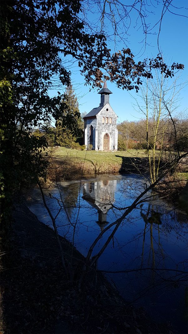 Es ging über Feldwege, zum Teil asphaltiert, am Waldrand und an Wiesen vorbei, bis wir nach einer Straßenüberquerung eine kleine Siedlung mit einer winzigen Kapelle erreicht haben.