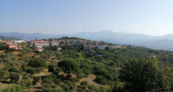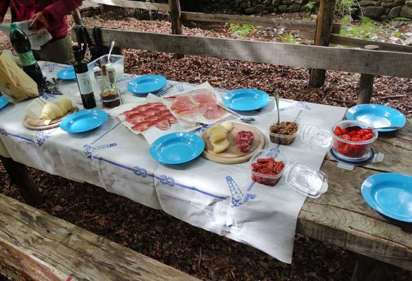 Heute ging es mit 17,7 Gehkilometern und 730 Höhenmetern deutlich mehr zur Sache. Der Minibus brachte uns in 60 Minuten zu einem Bergstädtchen namens Laurino im Herzen des Nationalparks. Zuerst stärkten wir uns mit einem Espresso auf der Piazza. Von dort ging es stetig bergauf auf dem höchsten Gipfel mit 1.020 Metern am Monte Calvello. Trittsicherheit und Kondition war gefragt. Janina hatte ein Picknick mit italienischer Wurst, Schinken, Tomaten, und Melonen organisiert. Sie hatte uns bei der abendlichen Besprechung vor Dornen und Kletterranken gewarnt und zu langärmeliger Kleidung geraten. Diesen Rat haben wir nicht alle befolgt bzw. vergessen. Entsprechend hatten einige Wanderer Risse und Schrunden an Armen und Beinen, die allgemein beim Abendessen von den Nichtwanderen bewundert wurden.