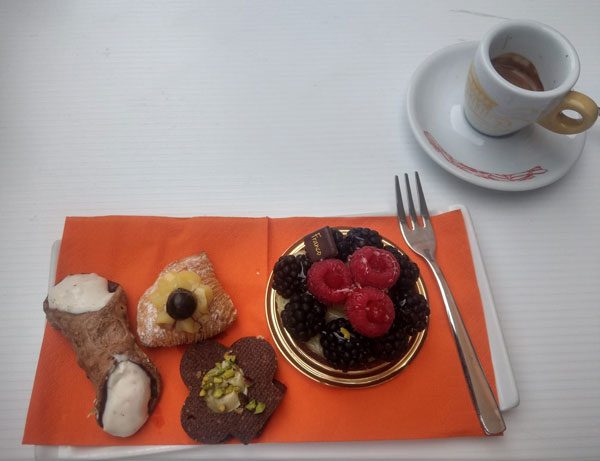 Heute war der erste Ruhetag der Wanderwoche. Wer wollte, konnte eine kürzere Wanderung, oder eine Mountainbiketour unternehmen. Ich zog es vor die Pasticceria Franco, die beste Konditorei unseres Ortes Marina di Casal Velino aufzusuchen. Mit einem Frosch-Mountainbike war man in nur 5 Minuten da. Sie bietet ein leckeres Angebot an kleinen und größeren Törtchen.