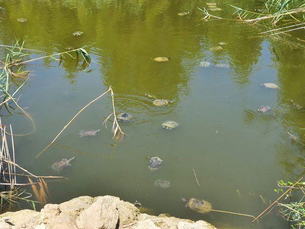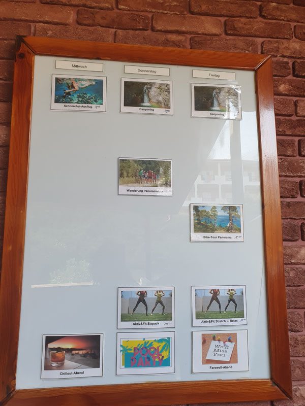 Ich habe leider nur an der Wandertour zum Schildkrötenteich am Donnerstag teilgenommen. An diesem Tag wurde keine Mountainbiketour angeboten. Die Wanderung war 19 km lang und führte hauptsächlich durch die pralle Sonne, so dass der erste Stopp direkt am Supermarkt im Ort war, wo sich jeder mit ausreichend Wasser eindecken konnte. Das war auch nötig bei weit über 30 Grad. Die Wanderung war wirklich toll. Es gab unterwegs viel zu sehen. Das Highlight war natürlich der Schildkrötenteich. Dort verbrachten wir unsere Mittagspause und konnten im Schatten Energie tanken. Auf dem Rückweg kehrten wir alle gemeinsam im Ort in einer kleinen Taverne ein, bei der wir uns bei leckeren griechischen Spezialitäten zu kleinem Preis stärkten.