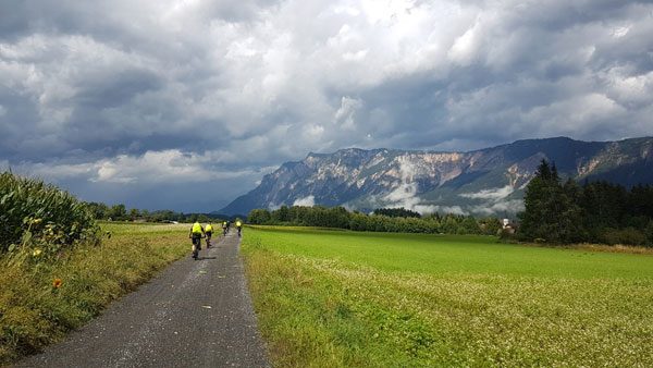 Die ersten Kilometer, die wir an der Drau fahren wollen, gehen so nicht wegen Überschwemmungen. Aber unser Guide findet fix den richtigen Weg. Es ist zunächst auch trocken und mit bald erreichen wir das erste Waldstück. Einer aus der Gruppe macht den ,Schlussmann', damit wir auch niemanden verlieren. Das klappt auch super.
