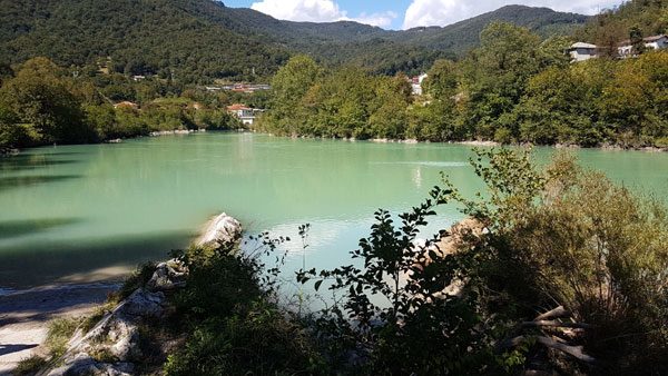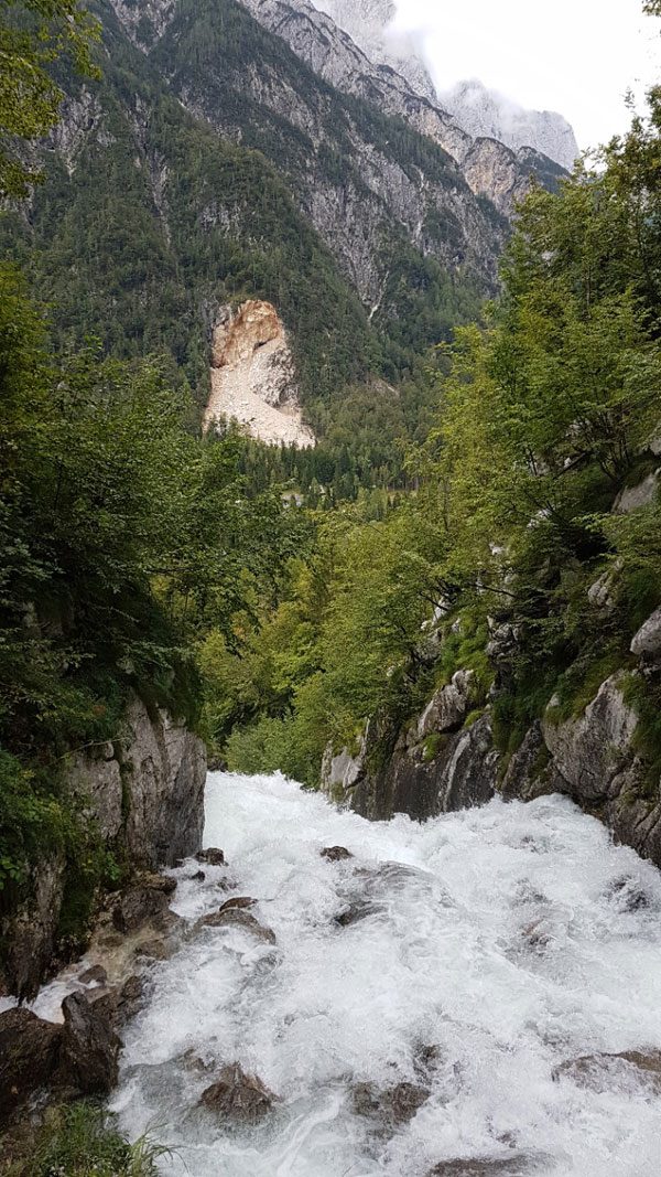 Unten angekommen pausieren wir noch kurz und Nathan erklärt uns den Rest der Etappe. Es geht noch etwa 7 km an der Straße entlang, dann auf einem kleinen Nebenweg hinab zur Soca, wo wir noch ein schönes Foto machen können. Die restlichen Meter in unseren Zielort Kobarid gehen ganz entspannt.