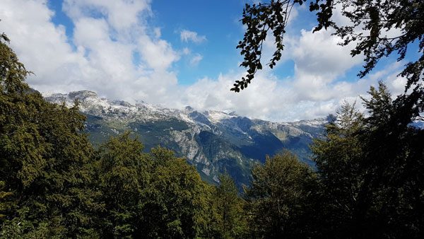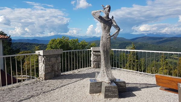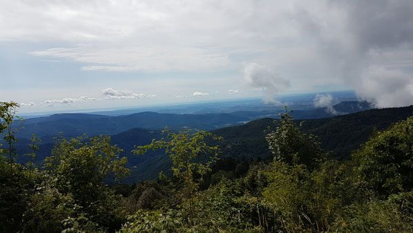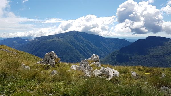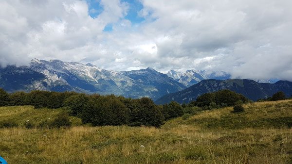 Dann beginnt auch schon der weitere Anstieg zum Matajur. Ich fahre eine ganze Strecke mit einer anderen aus der Gruppe und durch das viele Quatschen ist es gleich weniger anstrengend. Die Ausblicke werden immer schöner, weit hinten sehen wir das Mittelmeer. Herrlich. Und irgendwann sind wir plötzlich oben. Wir machen Fotos, warten noch auf die nächsten und gehen dann aber schon in die Mittagseinkehr, einer urigen Hütte, wo es phantastisches Essen gibt.