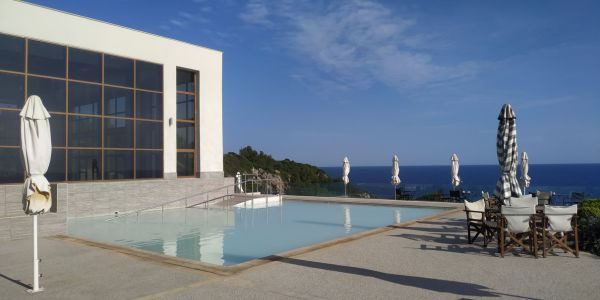 Unsere selbstorganisierte Biketour führte uns zum Agia Paraskevi Thermal Spa in Loutra, etwa 30 Kilometer südlich von unserem Wohnort Possidi. Wir fuhren den Hinweg über den Bergkamm, sodass wir hier den Großteil der Zeit und Energie für brauchten. Der Ausblick war die Anstrengung aber wert, und die Wärme des Spas tat dann erst richtig gut.