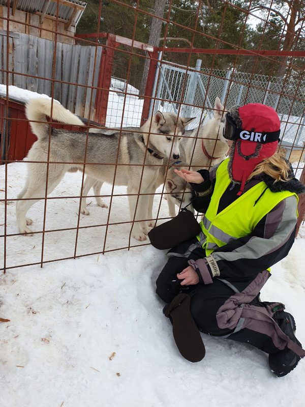 Nachdem wir mit warmer Kleidung ausgestattet waren, durften wir erst einmal die Hunde begrüßen. Wer schon einmal auf einer Husky-Farm war, weiß wie ausgelassen die Stimmung ist, wenn die Hunde merken, dass die Schlitten vorbereitet werden. Jeder will dabei sein!