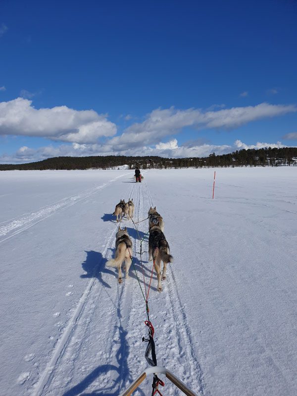 Die ersten Meter waren holprig, wild und etwas wackelig, aber sobald wir den kleinen Hügel hinunter und auf den zugefrorenen See gefahren waren, war da nur noch das rhythmische Hecheln der Hunde und das leise Knirschen des Schnees unter den Kufen von meinem Schlitten.