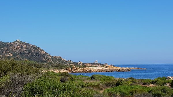 Meine Lieblingswanderung war die Küstenwanderung zur Kapelle Capo Camino. Sie startete im berühmten Naturschutzgebiet Biderosa-Park. Von hier ging es immer direkt an der Küste entlang Richtung Norden. Der Untergrund wechselte ständig zwischen Sand, Kies und Steinen, teilweise gab es auch kleine Kletterpartien über größere Felsbrocken. Schon von weitem konnte man oberhalb der Küste erst einen Leuchtturm und noch weiter oben die Kapelle sehen. Nach einem Aufstieg erreichten wir nacheinander die beiden Gebäude, wobei der Leuchtturm nicht sehr sehenswert war, die Kapelle hingegen umso mehr.