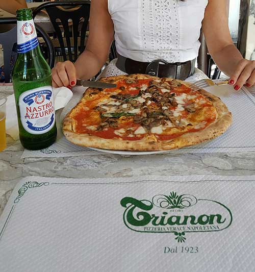 Pizzeria Trianon da Ciro, Via P. Colletta 44/46, Napoli, 1923 gegründet, eine Pizzeria mit mehr als vierhundert Plätzen. Sie ist bekannt für ihre Pizza so groß wie ein Wagenrad. Die Auswahl zwischen über zwanzig verschiedenen Pizzasorten mit einem Durchmesser von mehr als einem halben Meter fällt schwer.