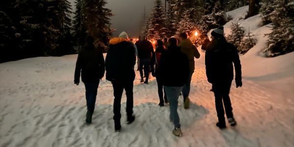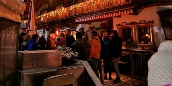 Das Highlight der Abende ist die Fackelwanderung - absolut klasse! Mittwoch sind wir nachmittags mit der Gondel auf die Hütte gefahren, und dort wurde gefeiert, sehr lecker gegessen und anschließend ging es auf frisch beschneiten Wegen ins Tal.