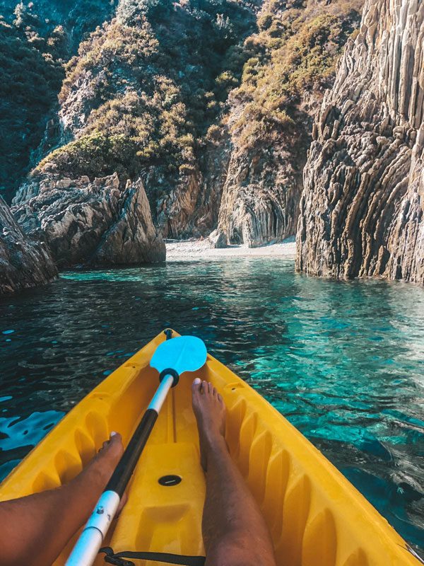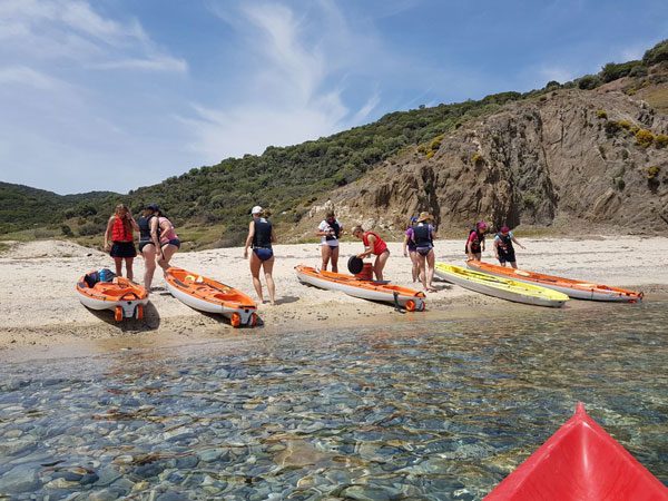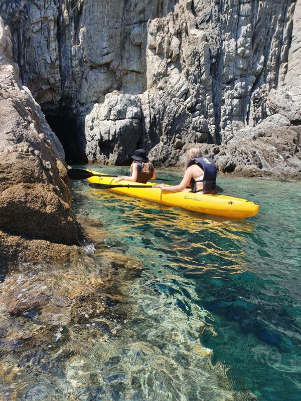 ... steigen ein und paddeln die ersten Meter raus aufs Meer. Mit genügend Abstand zum Strand paddeln wir, jeder in seinem eigenen Tempo, Richtung Süden bis zur Felsküste. Hier sammeln wir uns und fahren dann hintereinander an der Felsküste entlang. Wenn Wind und Welle es zulassen, fahren wir durch eine kleine Höhle, wo wir gerade so mit den Kajaks durch passen. Danach kommt ein schöner Canyon, wo man sehen kann, welche Kraft das Wasser hat. Die Felsen sehen aus wie Holz, welches schon lange als Treibgut auf dem Wasser schwimmt.