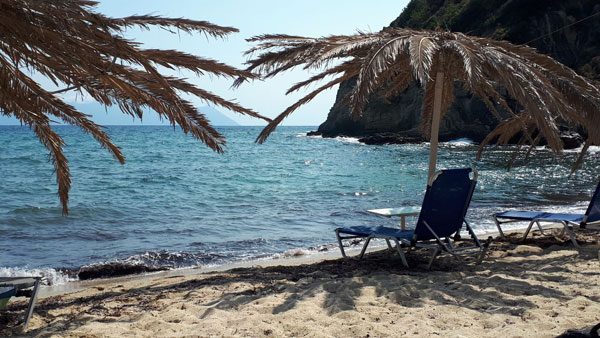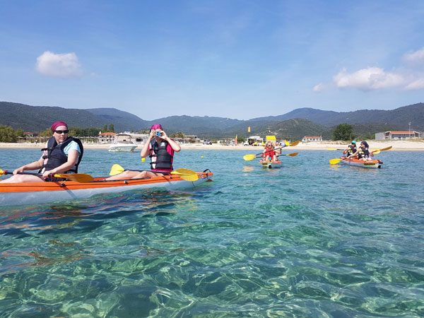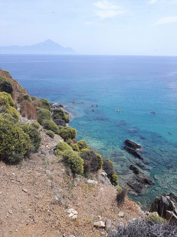 Wir sammeln uns dann nochmal am „kleinen Athos“ oder auch Möwenkackinsel genannt. Hier gibt es ein paar letzte Instruktionen zum Anlanden an der Wassersportstation. Während wir durch den Guide die Instruktionen bekommen, haben wir einen wunderschönen Blick auf den langen Sandstrand von Sarti.