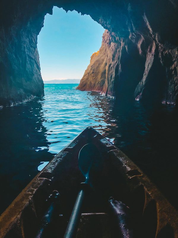 Nach einer Pause, in welcher wir schnorcheln, schwimmen oder einfach nur am Strand entspannt haben, treffen wir uns wieder an den Kajaks. Jetzt wartet noch die Fledermaushöhle auf uns. Wir paddeln mit den Booten zum Eingang. Hier können wir dann immer einzeln in die Höhle fahren. Mit viel Glück können wir auch ein paar Fledermäuse sehen oder hören.