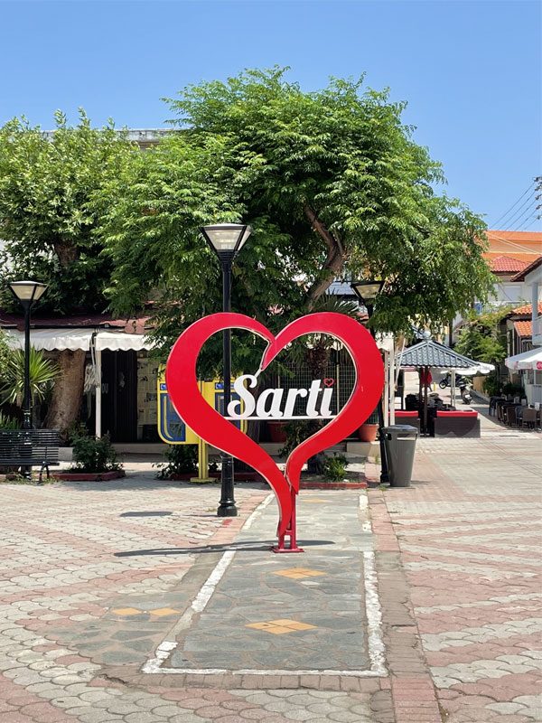 Zur Umgebung: Sarti ist ein wundervolles kleines Städtchen. Es bietet Geschäfte zum Bummeln, Tavernen und Cafés an der Strand-Promenade. Dabei ist es aber authentisch und nicht zu touristisch. Vom Hotel aus ist man nach einem kleinen Spaziergang dort. Wir lernten von unseren Guides: Es darf wohl in der Bucht kein Haus mit mehr als zwei Geschossen gebaut werden. Deshalb gibt es glücklicherweise keine großen Hotel-Bunker.