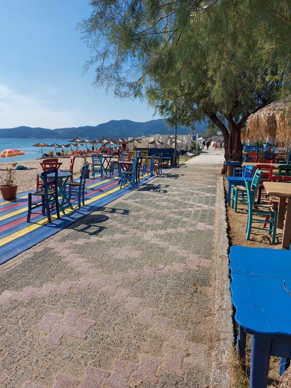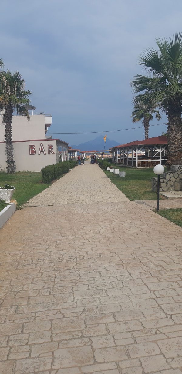 Das Sarti-Beach liegt direkt am feinen Sandstand und dieser lässt keine Wünsche offen: klares, sauberes Meerwasser, einen tollen Blick auf den heiligen Berg Athos, eine coole Beachbar in der abends immer Party ist und getanzt wird, bis keiner mehr kann. :)