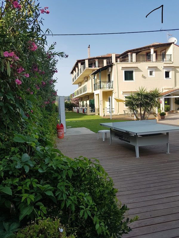 Man kann die Anlage des Frosch Hotel San Georgios mitbenutzen. 2-3 Minuten zu Fuß entfernt. Dort gibt es eine große Liegewiese, einen schönen Pool, Tennisplatz, Beachvolleyballfeld und eine Poolbar, die auch kleine Snacks anbietet. Das Fitnessprogramm und das Beachvolleyballcamp finden dort statt. Das Hotel liegt gegenüber vom Strand und der Mango Bar wo es Abendessen gibt, ist jedoch im Ganzen etwas ruhiger.