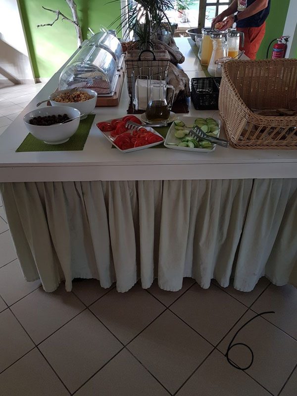 Das Frühstück ist einfach, aber frisch und ausreichend. Man sollte kein 4 Sterne Buffet erwarten. Es gibt 2 Sorten Brot, 3 verschiedene Wurstsorten, 2 Käsesorten, Müsli, Obstsalat, Joghurt, Kuchen, Eier, Marmelade und Nutella, sowie Säfte, Wasser und Kaffee. Schön wäre vielleicht ein wenig mehr Abwechslung, bzw. mit Frischkäse oder Camembert. Gegessen wird im Paradise draußen auf einer Terrasse an langen großen Tischen.