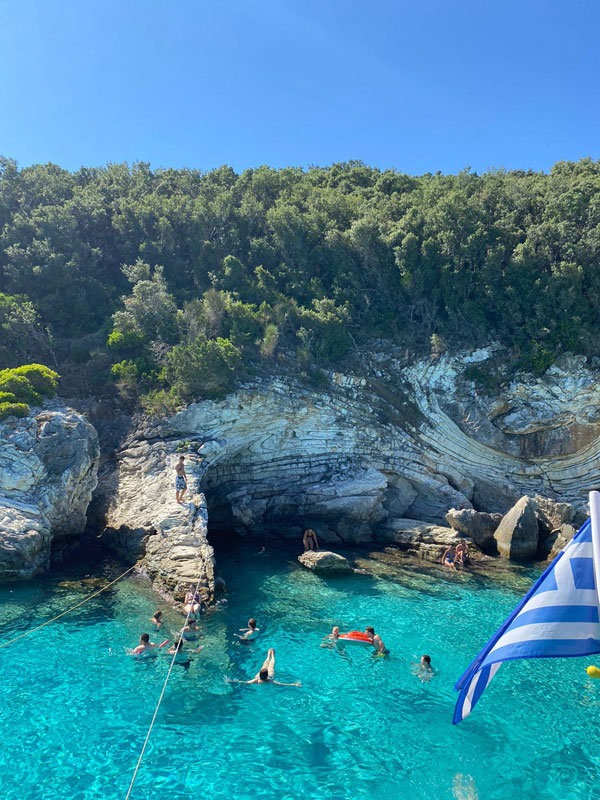 Mit einem kleinen Boot ging es zur Insel Paxos und zu verschiedenen kleinen Buchten, an denen jeweils ein Badestopp eingelegt wurde. Zwar waren auf dem Boot auch noch andere „Nicht-Frosch“-Gäste und die Buchten auch kein Geheimtipp mehr, dennoch waren insbesondere die Badestopps in kleinen Buchten mit kristallklarem hellblauem Wasser ein echtes Highlight.