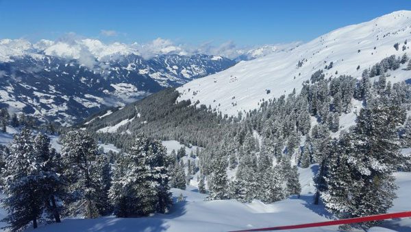 An den freien Skifahrtagen zog es uns zum Spieljoch. Hier liegt die Bushaltestelle 200 m vom Haus entfernt. Das Gebiet ist recht klein, jedoch gab es am Morgen keine Schlange am der Gondel. Also direkt hinauf und die Talabfahrt nach Fügen genießen. Am Ende der Geolsalm-Talabfahrt kann man alle 20 Minuten den Bustransfer nach Hochfügen nutzen und dann wieder über herrliche Pisten nach Kaltenbach fahren.
