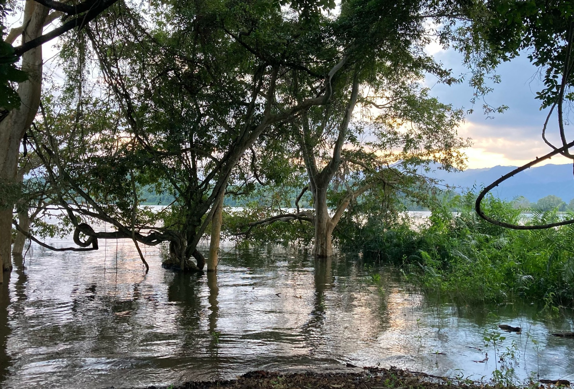 Bei leichtem Regen starteten wir am nächsten Morgen die zweite Tour. Nach ca. 3 Stunden stellte sich heraus, dass der weitere geplante Weg nicht gut begehbar war. Daher nahmen wir eine andere Strecke die die Tour dann etwas verlängerte und auch etwas abenteuerlicher machte. So einen richtigen Weg konnte ich nicht mehr erkennen, eigentlich liefen wir einfach querfeldein durch den Regenwald. Das war schon auch sehr cool! Sowieso die Geräusche der Vögel und immer irgendwo ein Wasserrauschen… herrlich. Ich weiß nicht wie der geplante Weg gewesen wäre, aber wo wir liefen ging es oft ordentlich hoch und runter! Dass Upendra und Mutu uns hier gut durchführen war allerdings klar. Als wir wieder auf den geplanten Weg trafen gab es erstmal eine (verdiente ;-)) längere Essenspause und wir ließen uns das Lunchpaket schmecken, das wir morgens von der Familie mitbekommen hatten. Nach ca. 7 Stunden waren wir dann am Bus, der uns zur Kanu-Überfahrt zu den Baumhütten am See brachte. Erstmal schwimmen im See – wer wollte, schon vom Kanu aus oder, wie ich dann, später nach Ankunft vom Ufer aus. Das Wasser war sehr warm aber ich fands herrlich nach der Anstrengung des Tages. Es gab ein leckeres Abendessen u. a. ein 7-Gemüse-Curry, Hirsebällchen und Fladenbrot, später noch Lagerfeuer und eine Tanzvorführung, die uns alles Gute wünschen sollte, meine ich. Die Nacht in den Baumhütten verbringt man im Prinzip im Freien (mit Moskitonetz). Es mag zwar bequemer sein in einem Bett zu schlafen, aber ich fand die Geräusche der Nacht sehr interessant und das Erlebnis wirklich schön.