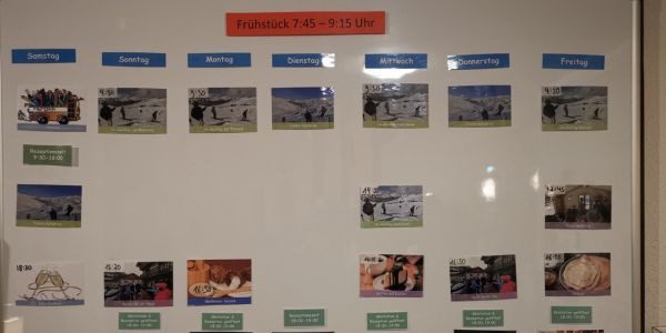 Mittags gegen 13 Uhr treffen sich alle (Skischule und Skiguiding) am vereinbarten Treffpunkt zur gemeinsamen Mittagspause. An drei Tagen endete die Skischule mit der Mittagspause und die Kinder wurden dort vor Ort den Eltern wieder übergeben.