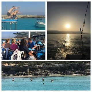 Als Ausgleich zu den sportlichen Anstrengungen lassen wir es uns an einem unserer Nachmittage auf der Bootstour zur blauen Lagune einfach mal ganz ohne Bewegung gut gehen und den Wind bei einem kühlen KEO um die Nasen wehen. Der Badestopp erfrischt (das Meer hat bereits jetzt schon gute 20°C), und das anschließende, auf dem Boot gegrillte Barbeque ist eine willkommene und gelungene Abwechslung. Die Rückfahrt im Sonnenuntergang hat Postkartenqualität, und der Drink an der Hafenpromenade setzt einen schönen Schlußpunkt hinter diesen Nachmittag.