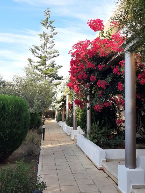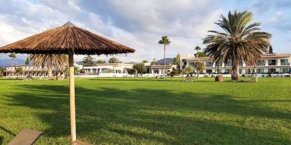 Das Hotel war schön und traumhaft gelegen. Die Hotelanlage reicht bis direkt ans Meer. Zwischen Hotel und Meer befindet sich nur eine große Wiese, die Teil der Hotelanlage ist. Das Hotel hat einen wunderschönen Garten und vor jedem Gebäude duftet es, weil riesige Thymianbüsche (!) und Bougainvillea dort wachsen.