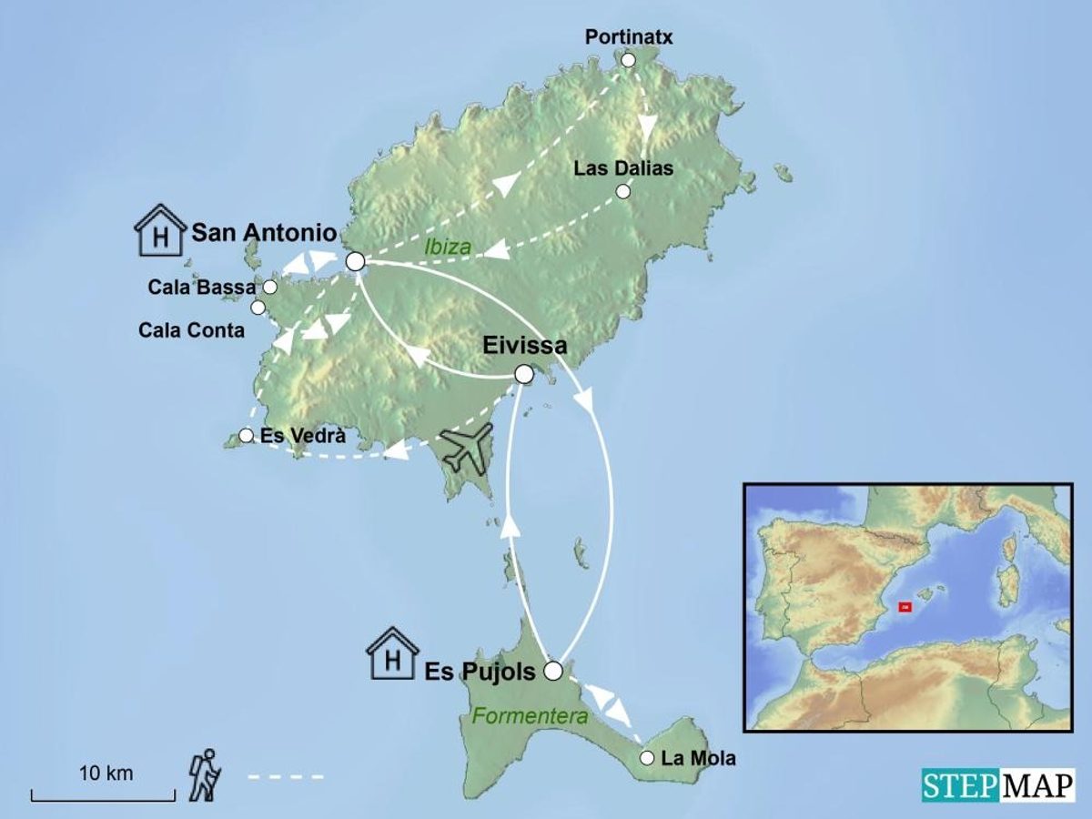 Entdeckt bei dieser Reise auf Ibiza und der Schwesterinsel Formentera die Höhepunkte beider Inseln. Sie bilden die schöne Inselgruppe der Pityusen, die zu den Balearen gehören. Ibiza ist die drittgrößte Insel der Balearen nach Mallorca und Menorca. Sanft geschwungene Buchten wechseln mit bizarren Steilküsten und vorgelagerten Felseilanden ab. Das Mittelmeer ist immer präsent und die über 60 Badebuchten laden wieder und wieder zum Verweilen und Träumen ein. Es erwartet euch eine mediterrane Insellandschaft aus dem Bilderbuch. Kultur erleben wir beim Besuch von Ibiza-Stadt, deren Altstadt Dalt Vila 1999 zum Weltkulturerbe erklärt wurde.