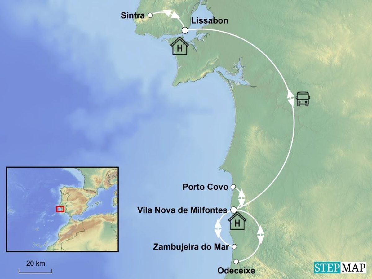 Die ersten drei Nächte genießen wir das moderne 3*-Hotel Fernicius Charme im Herzen von Lissabon. Nur wenige Minuten entfernt schlängelt sich die berühmte Straßenbahnlinie Nr. 28 durch die Stadt und bringt uns direkt in die verwinkelte Altstadt. Anschließend ziehen wir weiter ins 4*-Hotel HS Milfontes Beach im Alentejo, wo wir vier Nächte verbringen. Das Hotel liegt direkt an der Mündung des Rio Mira in den Atlantik und bietet einen atemberaubenden Blick über die Bucht bis zum Meer. Pool, Spa-Bereich und Fitnessraum laden zum Entspannen und Aktivsein ein. Das charmante Küstenstädtchen Vila Nova de Milfontes erreichen wir bequem zu Fuß und tauchen in die entspannte Atmosphäre dieses besonderen Ortes ein. Die letzte Nacht verbringen wir komfortabel im 3*-Hotel Star Inn Lisbon Airport, ruhig gelegen trotz der Nähe zum Flughafen – ideal für eine entspannte Abreise. In allen Hotels schlafen wir in komfortablen Doppelzimmern mit Dusche/WC, Satelliten-TV, Klimaanlage und kostenlosem WLAN.